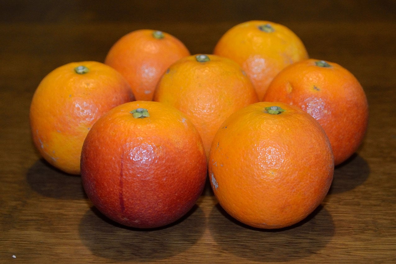 ブラッドオレンジの原産地はイタリアで 日本では希少性もあり高級品とされ、生食用のものはあまり出回っていません。 すっきりした酸味と豊かな風味、インパクトのある真っ赤な果実が特徴です。実が赤いのは抗酸化物資として知られている「アントシアニン」の色抗酸化物質を沢山含んでいるからです。食べ方はナイフで八つ切り(スマイルカット)にして食べるのがおすすめです。 ちょっと贅沢にジュースにしても美味しくいただけます。 外皮は写真のように傷がついているものが混じりますのでご了承下さい。